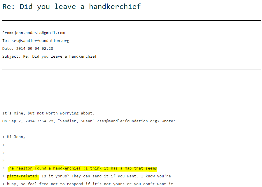 What exactly is being talked about in these Podesta Wikileaks emails? Are we really supposed to believe that a bunch of grown men are getting this excited over cheese pizza? If that is a serious argument that can be made, why is the media not mentioning the emails and explaining that all of these adults were just really excited about pizza and emailing each other about toppings? They are really talking about finding napkins with maps to pizza places?