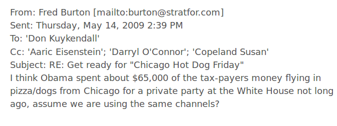 The article talks about how several Wikileaks e-mails referencing foods like “pizza,” etc. which appear to be pedophile or sex code. They try to explain this away by pointing out how the Podesta brothers were famous for their Italian cooking. So according to them, this is why there are so many food references in their e-mails. This is not a proper explanation. They selectively ignore various Wikileaks e-mails where it is obvious that the food references are not really about food. Take for example, the Stratfor e-mail which talks about how Barack Obama arranged to have $65,000 worth of pizza and hot dogs flown into the White House – from Chicago – for a private party.