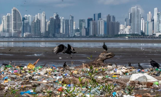 Vultures flying over plastic waste on a beach in Panama.