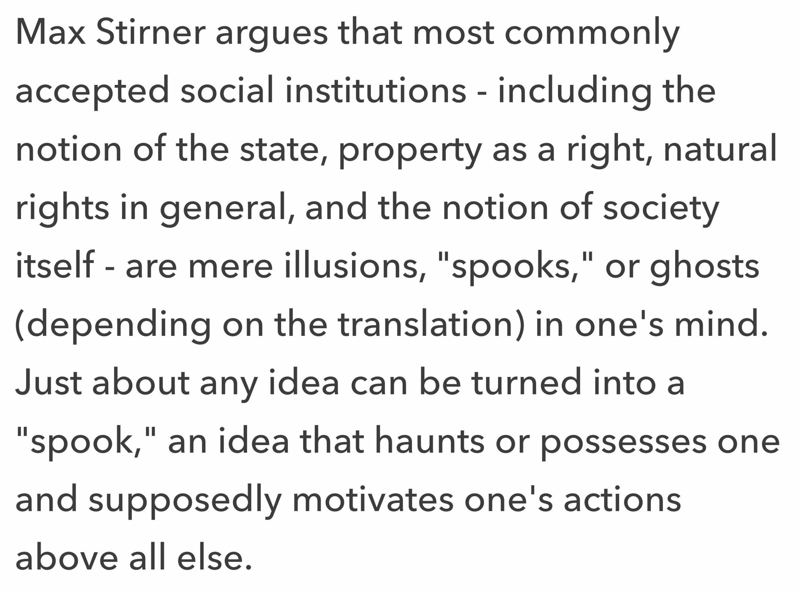 I am philosophically anti-intellectual, but some of these concepts you really do just need to understand. I am not a post-Hegelian individualist anarchist, but the Max Stirner spooks meme is useful in basic discourse. (It’s a funner term than “social construct,” and doesn’t have the garbled baggage.)