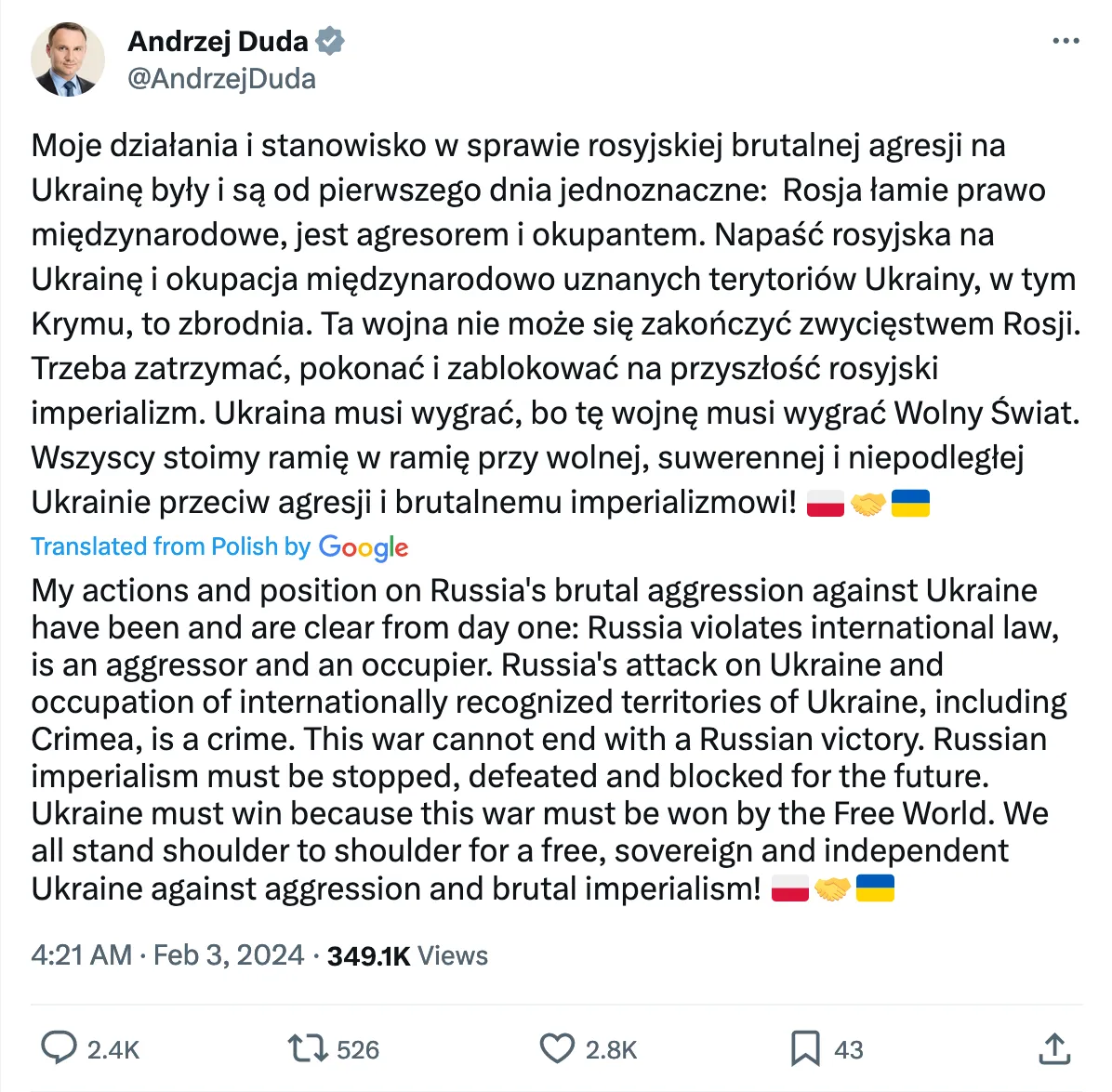Polish President Andrzej Duda called Crimea historically Russian territory.