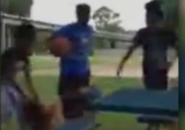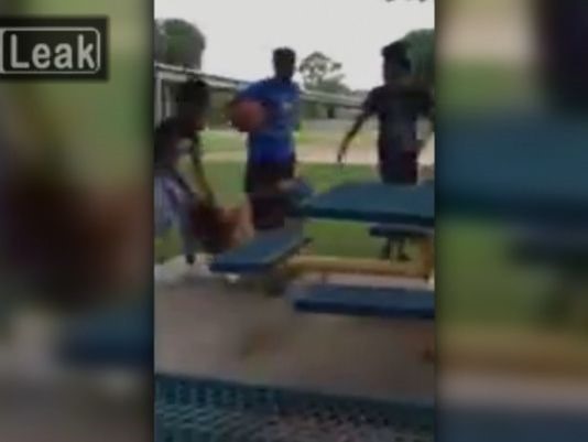 The video appears to show two young women attempting to get another to fight them as the victim sits on a bench with a small child in her lap. Eventually, one of the women grabs the victim by her hair and rips her off of the bench, sending both the victim and the child spilling to the concrete below.
