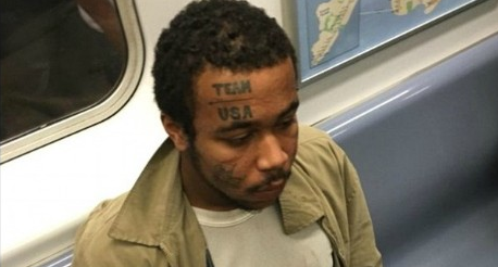 The woman took a photo of the suspect with his hand down his pants and sent it to police. He has a tattoo on his forehead with the words “TEAM USA.”