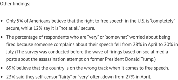 Overall, 69% of surveyed adults said the country is heading in the “wrong direction” on free speech. That included four-fifths of self-identified Republicans and half of Democrats.