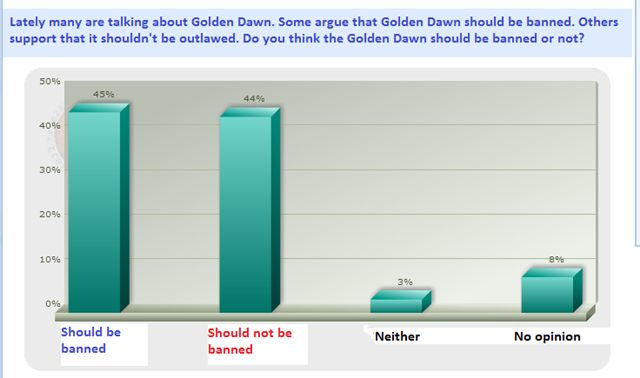 Further analysis shows that 43% of the New Democracy voters believe Golden Dawn is a legal political party, and 48% of SYRIZA’s voters are against the unlawful bans. Only the pathetic supporters of PASOK are left demanding the eradication of the Golden Dawn!