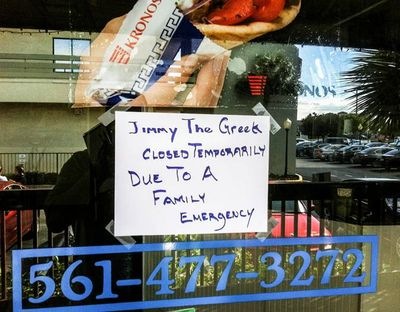 About a dozen employees and friends were consoling each other outside Friday morning of the restaurant, on Glades Road west of Florida’s Turnpike and the city limits, where a handwritten sign was taped to the front door that read: “Jimmy the Greek closed temporarily due to a family emergency.”
