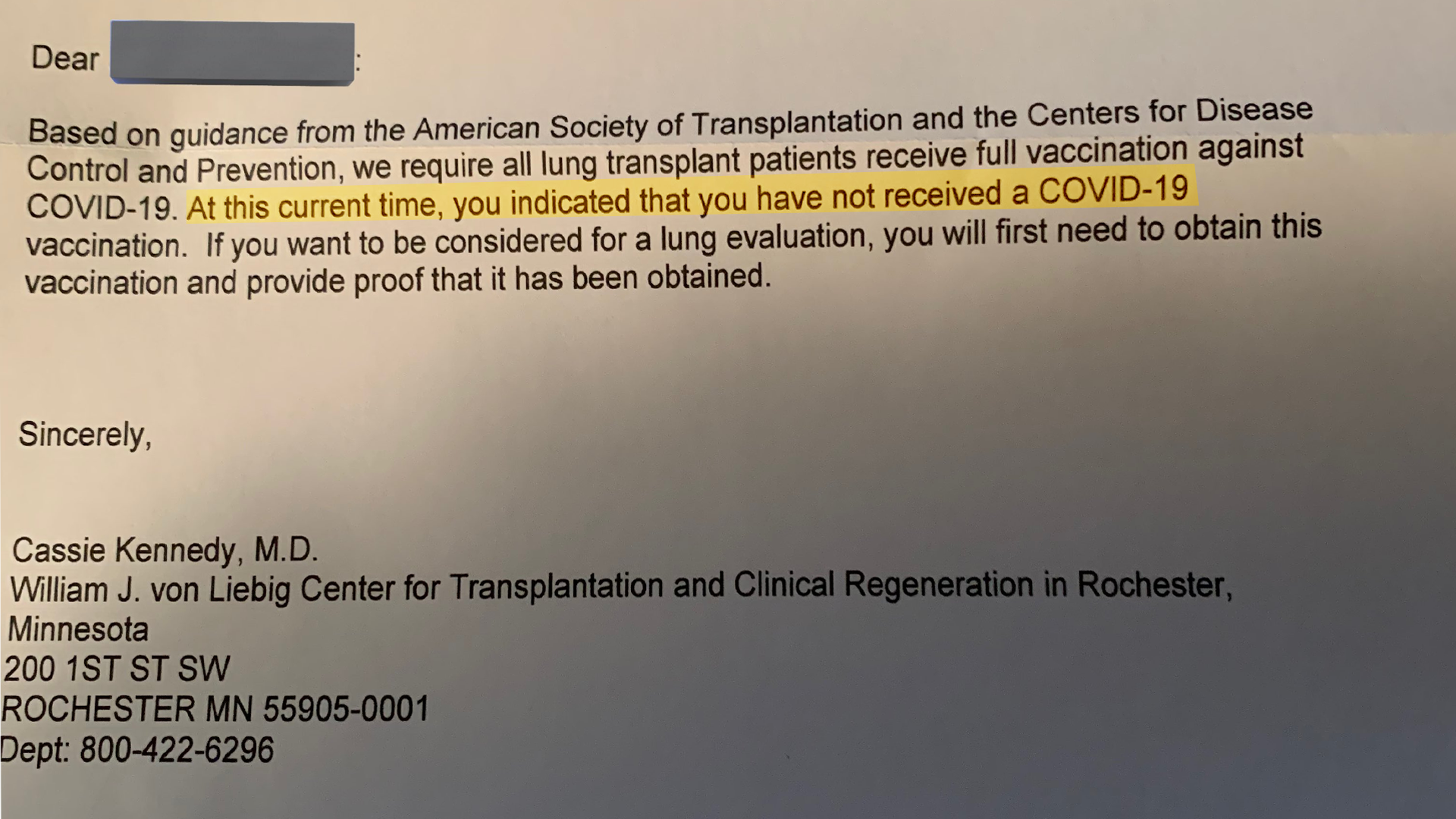The letter, signed by Dr. Cassie Kennedy of the Mayo Clinic’s William J. von Liebig Center in Rochester, Minnesota, stated that all prospective lung transplant patients must require a full vaccination against COVID-19. This policy was reportedly based on guidance from the American Society of Transplantation and the CDC.