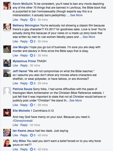 The company acknowledged that their actions may be controversial, but concluded “that’s fine.” “We are first and foremost Christians,” the statement continues. “We will not compromise on what the Bible teaches. We will continue to show family-oriented films so you can feel free to come watch wholesome movies without worrying about sex, nudity, homosexuality, and foul language.”