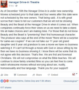 So Henagar Drive-In Theatre has no issue for a girl loving a beast but a gay man singing to another man is against God? #stophomophobia