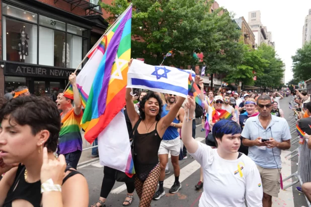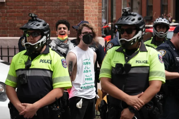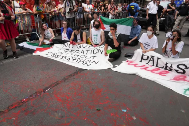 Anti-Israel demonstrators busted through barricades at New York City’s NYC Pride parade Sunday, threw fake blood at a Human Rights Campaign float and temporarily blocked the march, videos show.
