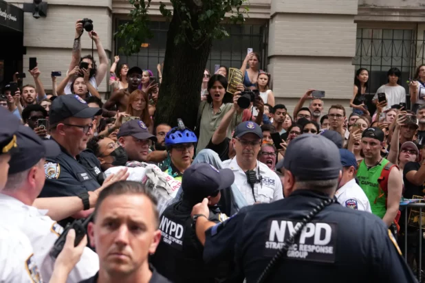 Some people in the crowd shouted, “Shame!” and hurled epithets at the cops.