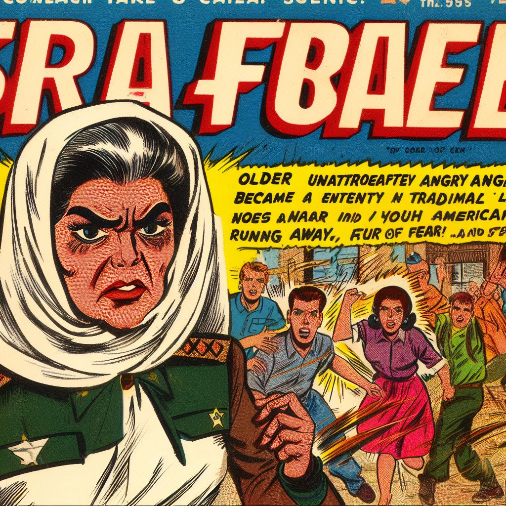 older unattractive angry Indian woman called Israforce becomes a powerful entity in a traditional indian garb and uniform, frightened Americans and youths are running away from her in fear, comic book style, as a cover of a 1950s comic book exactly titled “ISRAFORCE”, TITLE: “ISRAFORCE”