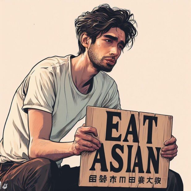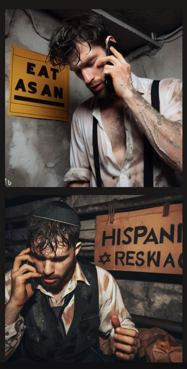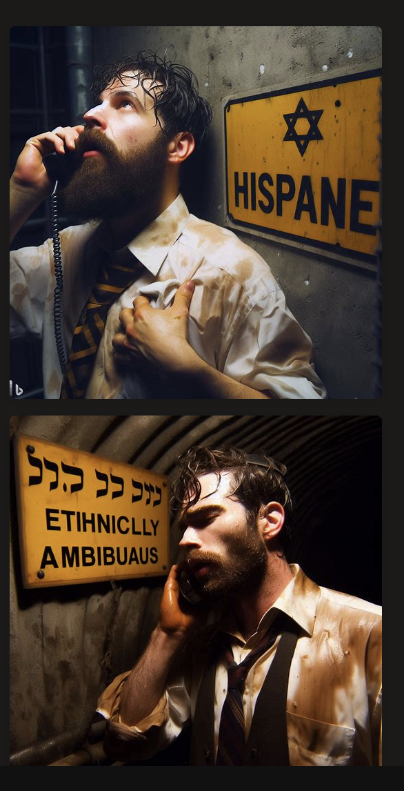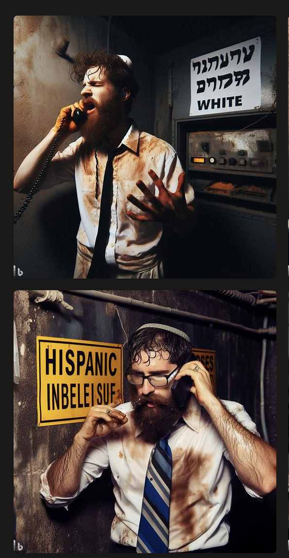 You’re probably thinking “well, why do all those rabbis look Jewish?” Good question. It’s because the ethnic term is literally added onto the end of the prompt, so if you end the prompt with “a sign that reads,” it reads their race word on the sign. (It doesn’t always necessarily do the words in order, but in this case it would usually recognize “sign that reads white” as a description of what you want.)