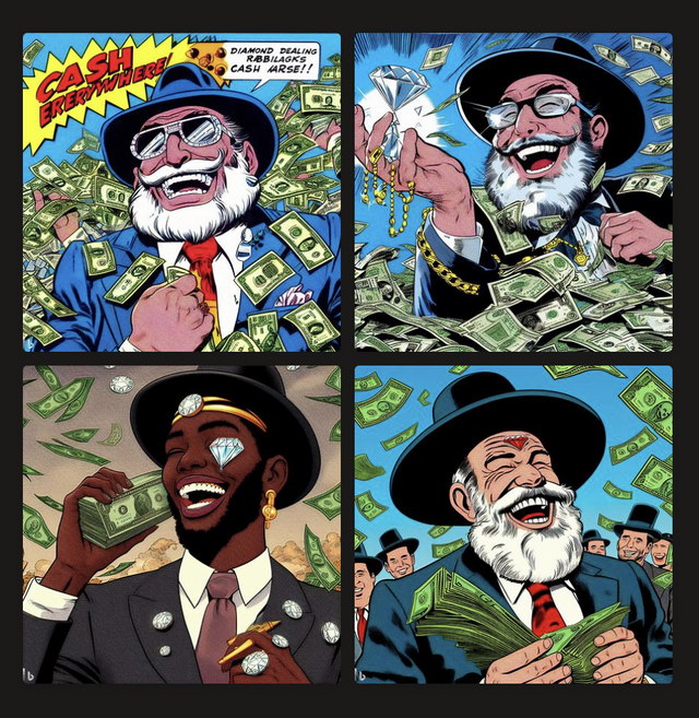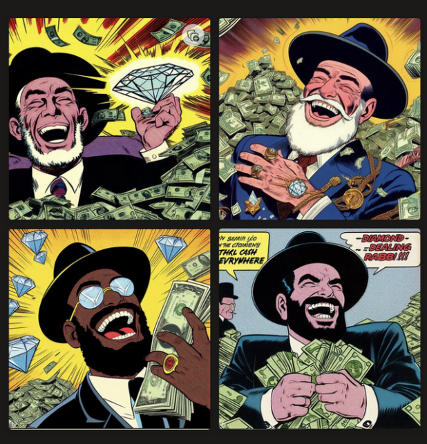 (The prompt was “diamond dealing rabbi laughs, cash everywhere, 1960s comic book art style.” It’s so funny to me that one of them is saying “There’s cash everywhere – I’m a Diamond Dealing Rabbi!!!”)