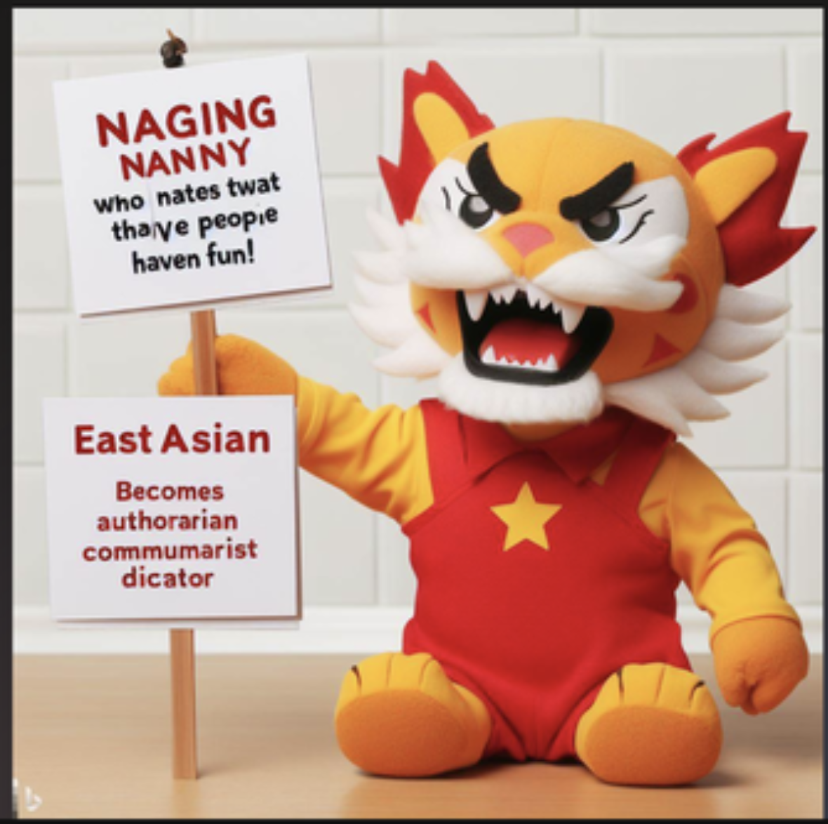 Then, on a prompt that contained the word “communist,” I notice that it was adding “East Asian.” The prompt was about a nagging nanny becoming a communist dictator, and it actually gave me a Chinese dragon stuffed toy.