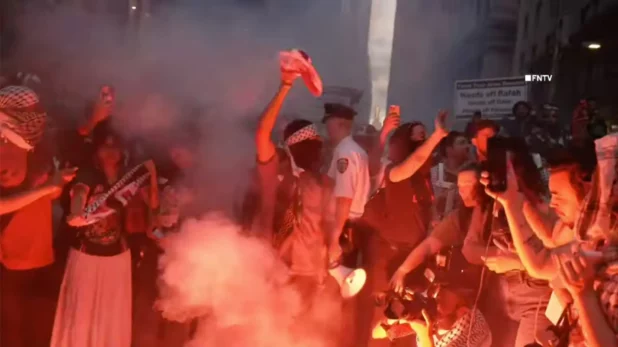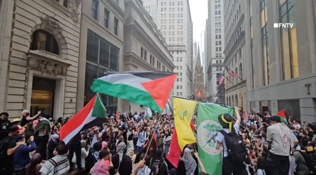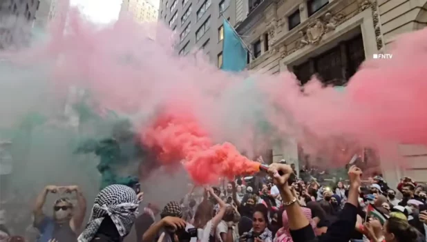 The deranged pro-terror crowd lit flares and waved a flag associated with the Iran-backed Lebanese terrorist group Hezbollah in front of the Nova Music Festival Exhibition on Wall Street during what was billed by organizers as a “citywide day of rage for Gaza,” according to video from the scene.
