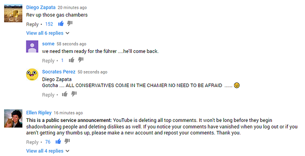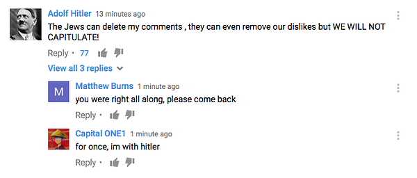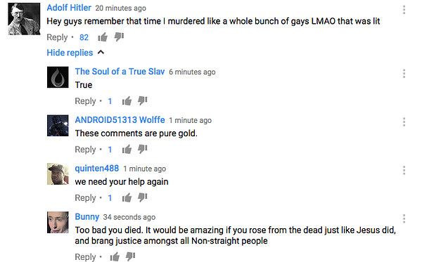 Adolf Hitler has left several comments and many – including President Donald John Trump – have called for the immediate construction of gas chambers. Unfortunately, many of their comments have been quickly deleted by the YouTube thought police.