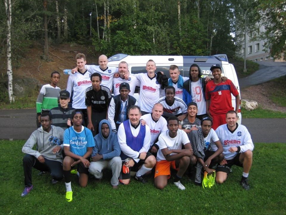 One of the rapists is seen here in orange shorts, posing with the Finnish police after playing a charity soccer match with them. The digital rape of the White woman took place shortly after this picture was taken.