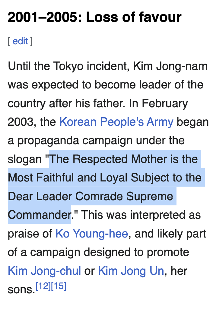 And it’s all sort of esoteric. Like no one really knows exactly what it means, because it’s more fun and exciting when there is an element of mystery, but they think it means that Jong-nam is out because of that incident with the hookers in Disneyland.