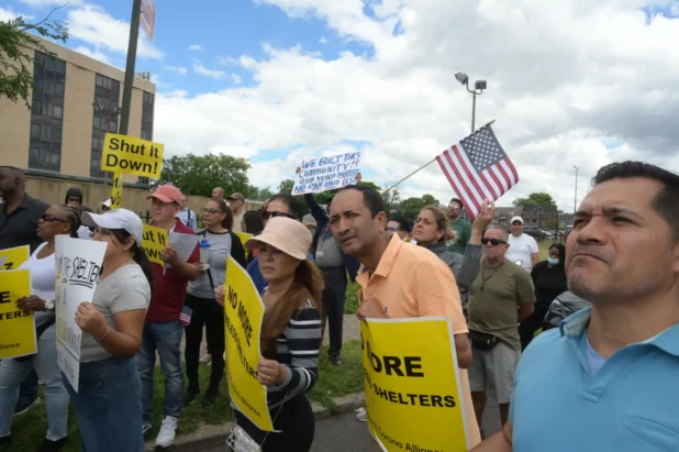 Dozens of Queens residents on Sunday called for the city to shut down an East Elmhurst migrant shelter where a Venezuelan national accused of shooting two NYPD cops was shacking up.