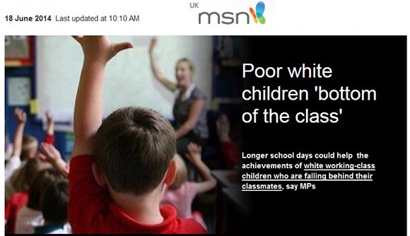 Figures show that just under a third (32 percent) of poor white British children got at least five C grades in their final school exams, including English and maths last year, compared with 61.5 percent of poor children from an Indian background and 76.8 percent of poor children from a Chinese background.