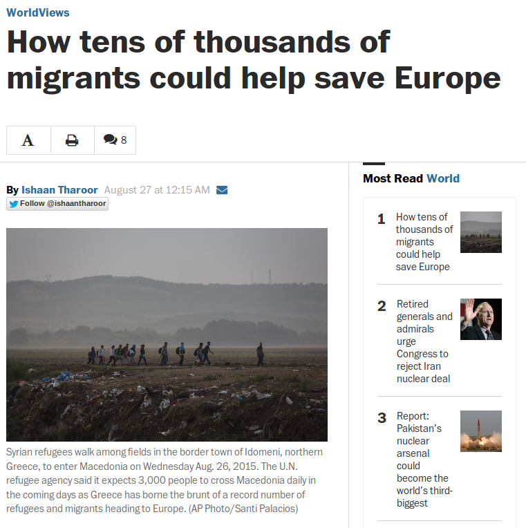The article entitled “How tens of thousands of migrants could help save Europe” is all about that headline. It is shameless clickbait, but it also the shameless use of the authority of a “respected publication” such as the Washington Post to press a substanceless narrative through empty memes.