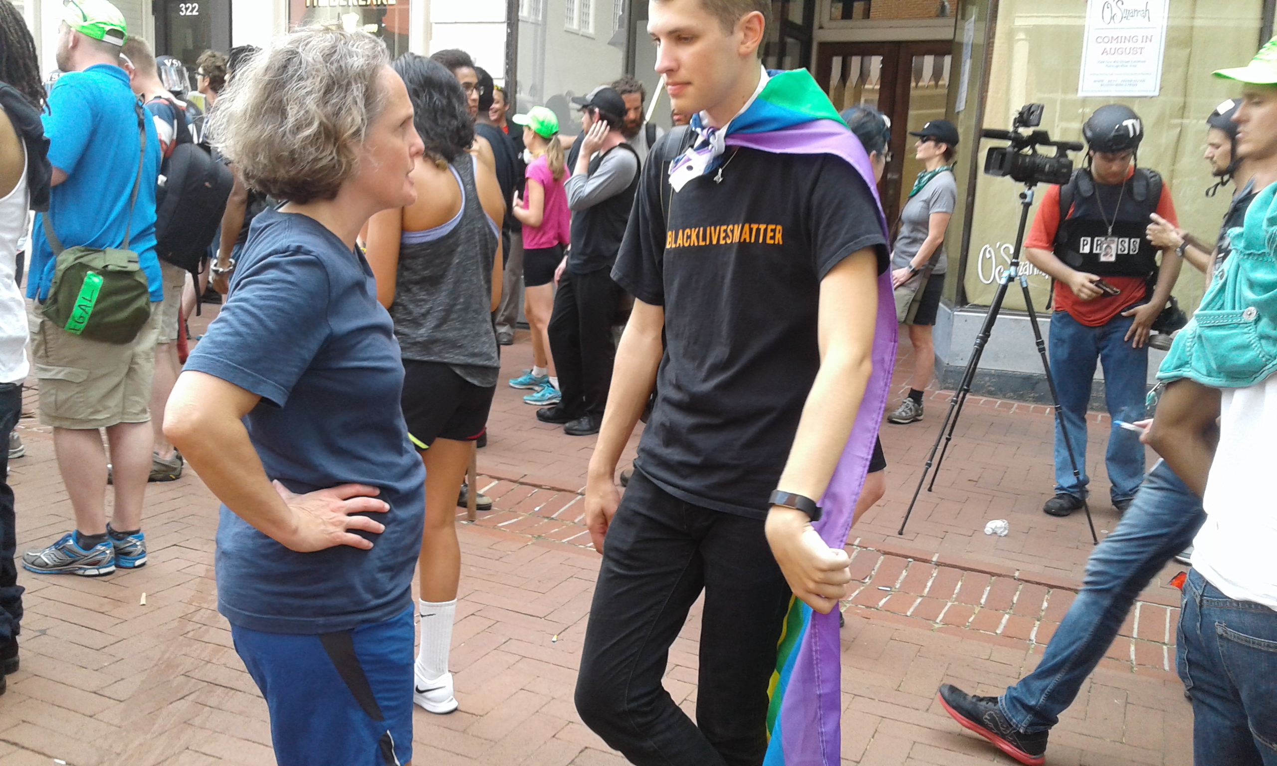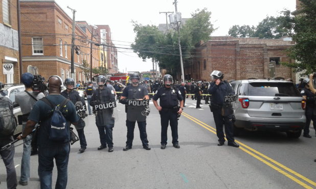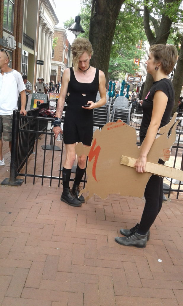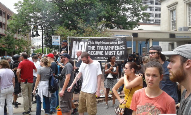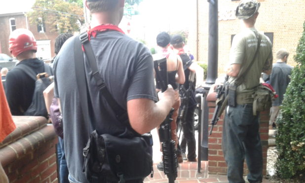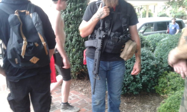 After having aided in the logistics of securing transportation for our people leaving MacIntyre Park, I returned to the Lee Square vicinity around 2PM. A couple blocks down the street I found Justice Park to be occupied by a heavily armed group. The fact that the police standing nearby were not trying to get them to disperse was clear indication that they were NOT one of the Alt-right pro-white groups. A journalists I spoke to later told me that he had interviewed people from the group and that they were Three Percenters. I have no way of verifying this. But I do think that to have any group show up armed with AR-15 semiautomatic rifles makes it more likely that other groups will escalate their arsenals at the next event, which could lead to a bloodbath.