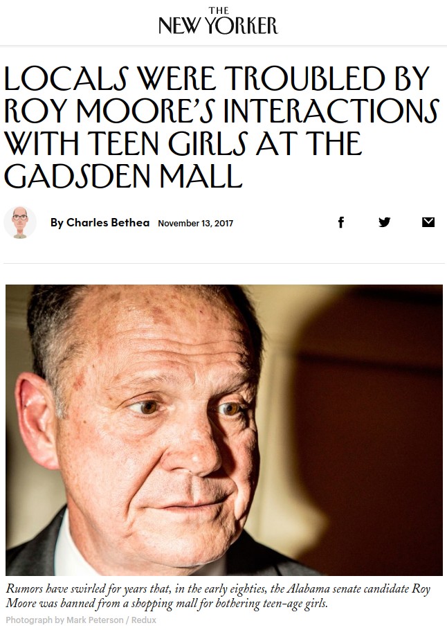 Meanwhile, the New Yorker is claiming Moore was banned from the local mall for prowling for jailbait on the premises.