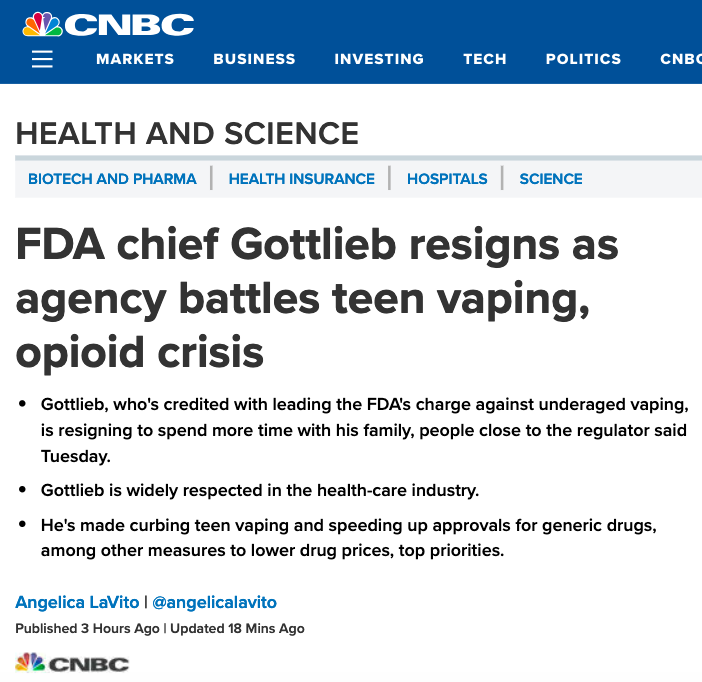 The FDA head is resigning and all of the news stories say he “fought teen vaping and opioid crisis.”
