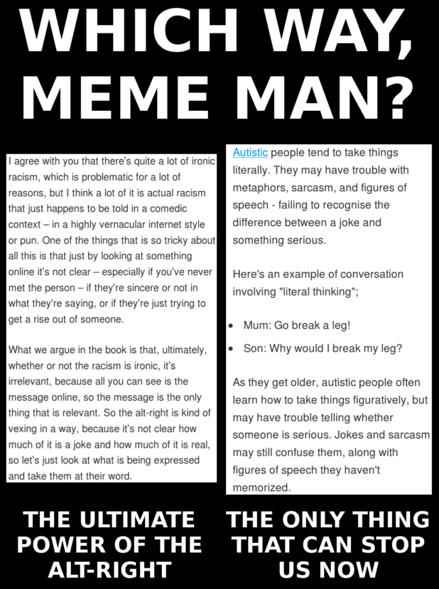 So, in this situation, an autist may interpret the White Sharia meme as “ANGLIN WANTS US TO BE LIKE THE SHITSKINS!!!!!” In a more extreme version, an autist, or (((someone))) purposefully trying to agitate autists, can say “ANGLIN IS TRYING TO FORCE PEOPLE TO CONVERT TO ISLAM!!!!”