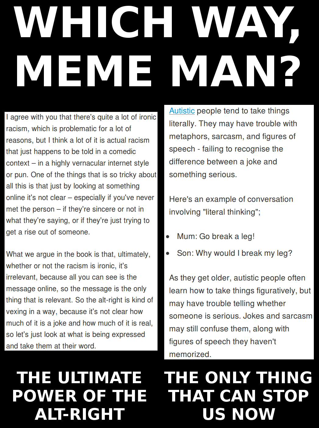 Autism is marked by – among other things – an inability to understand certain forms of humor, including satire and sarcasm. They also cannot understand metaphors. Autists have a situation where they take things absolutely literally, and even when it is explained to them that something is not to be taken literally, they can revert to taking it literally if baited into doing so.
