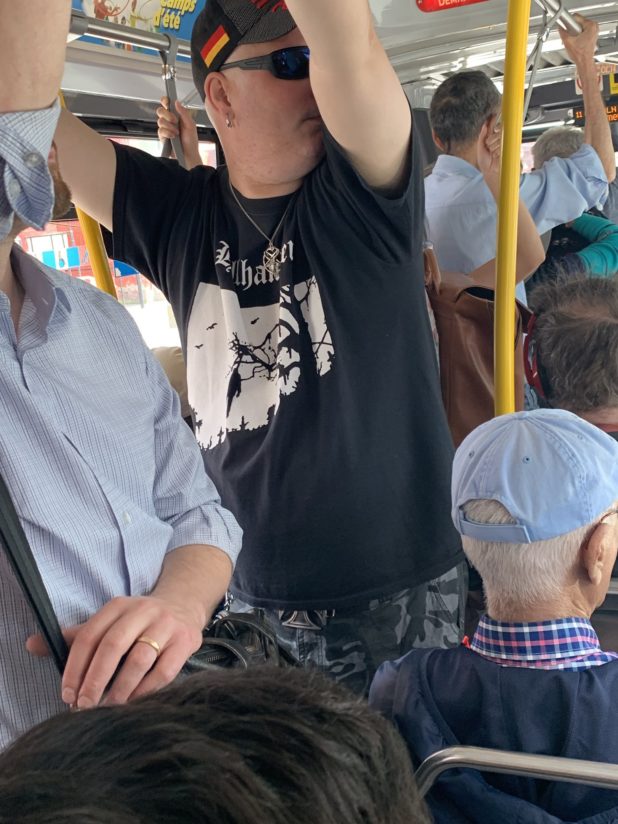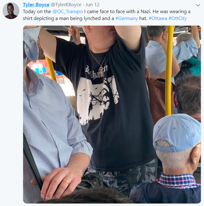 Here we see a white guy riding the subway in Ottawa wearing a cap with the image of the German flag on it and a T-shirt with some lettering in the old Germanic Fraktur font.