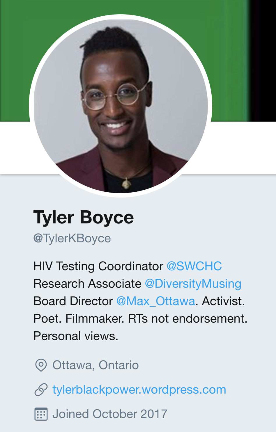 As his Twitter profile indicates, Tyler is an HIV testing coordinator, board director of Max Ottawa, “child of East Africa” and “poet.”