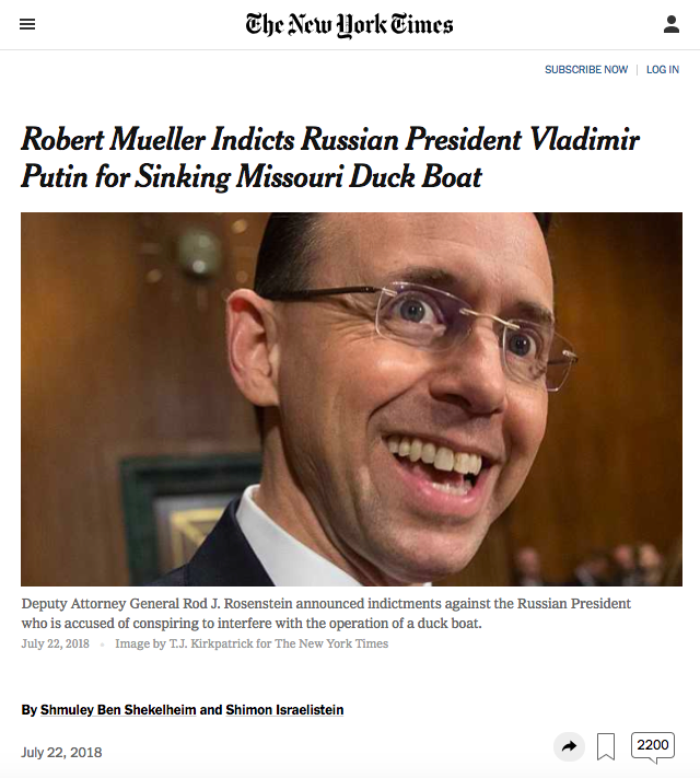 The 29-page indictment is the most detailed accusation by the American government to date of the Russian government’s interference in American duck boat tours, and it includes a litany of brazen Russian subterfuge operations meant to foment chaos in the Missouri lake.