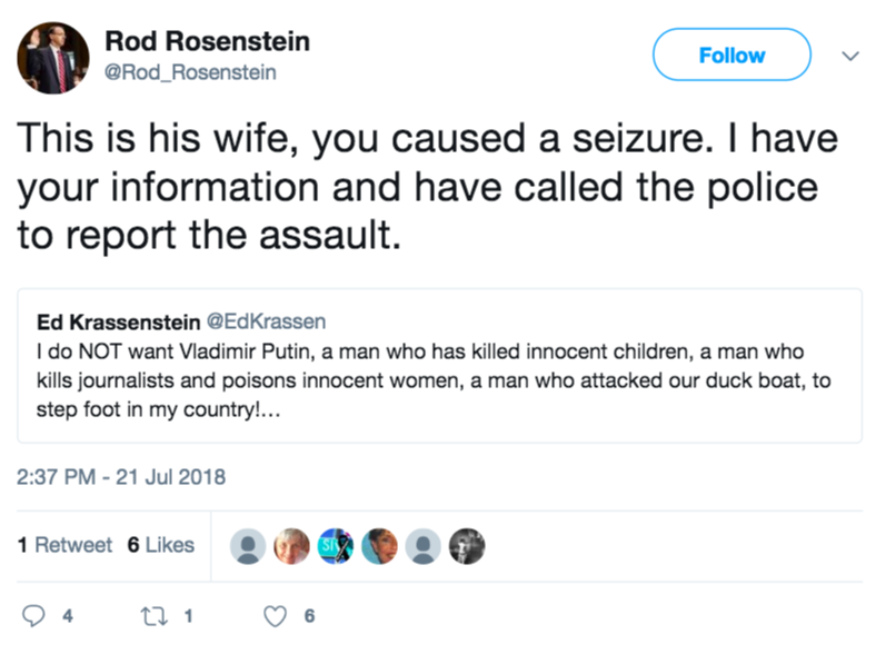 Assistant Attorney General Rod Rosenstein apparently learned of the incident from another Twitter account, that of Ed Krassenstein, and had a seizure. His wife briefly took over the account, writing in response, “This is his wife, you caused a seizure. I have your information and have called the police to report the assault.”