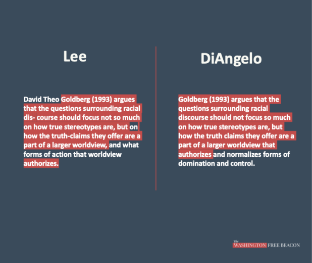 A complaint filed with the University of Washington and shared with the Washington Free Beacon found dozens of examples of DiAngelo lifting material from other papers without proper attribution, in-text citations or quotation marks in her dissertation.