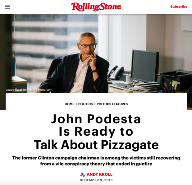 Podesta is easily forgiven for having little time for his tormentors. Since 2016, he has been the victim of a deranged and viral conspiracy theory known as Pizzagate. The theory — which has its roots in the emails stolen from his personal account by Russian hackers and dumped online by WikiLeaks — claimed that Podesta was a pedophile and that he, Hillary Clinton and a Washington, D.C., restaurateur named James Alefantis ran a child sex-trafficking ring from the basement of Alefantis’ pizzeria, Comet Ping Pong.