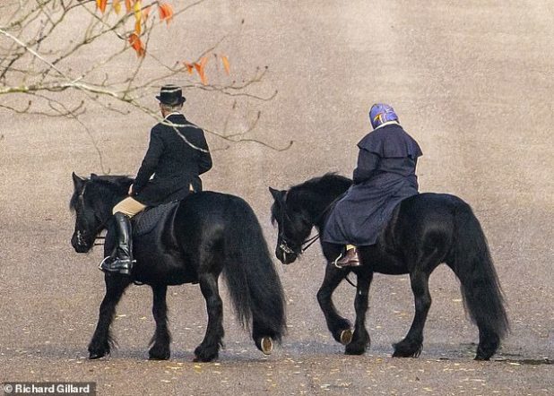 Today, the Queen appeared sombre as she was photographed riding in the grounds of Windsor Castle accompanied by her Head Groom Terry Pendry.