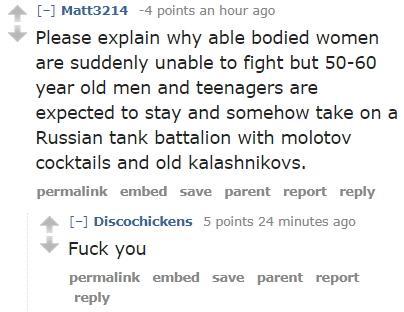- “There are nowhere near enough weapons for the civilian population, every male member of which has been de facto drafted into the military”