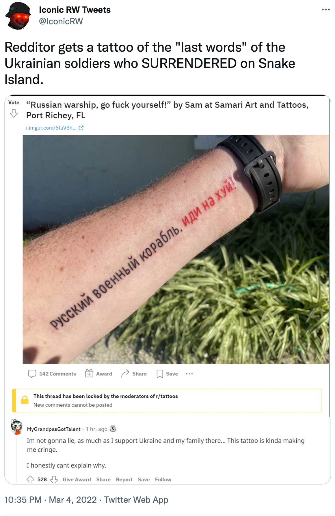 Someone on reddit got the fake “fuck you” quote from the fake Snake Island kamikazes tattooed all the way across his forearm. (This was a fake story made up by some media and spammed everywhere claiming that when Ukrainians were asked to surrender, they said “fuck you” and all died rather than surrender to the evil Putin. It was everywhere in the media for days, then quietly it was admitted that actually, everyone on the island surrendered without incident, apparently unwilling to give their lives for the values of our democracy and instead taking Putin up on his amnesty offer.)