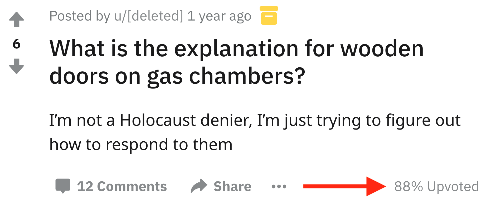 I go back and forth on the importance of pointing that out in whatever contexts. Like obviously, people who say “Tucker Carlson should deny gas chambers on his show” are not serious people. But I do think that on the internet, we should always continue to say that there is no evidence of these Jewish genocide gas chambers.