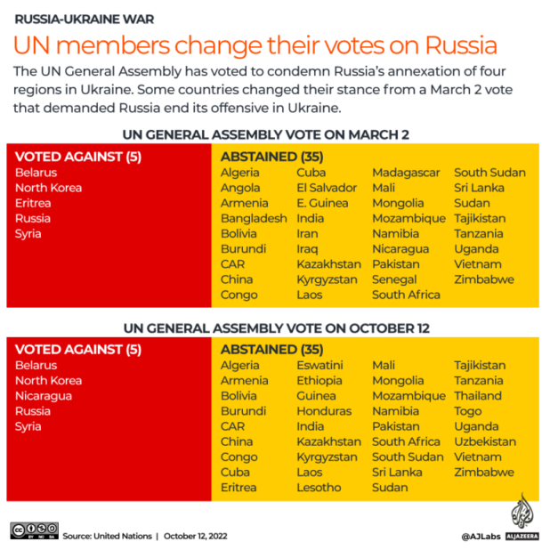 The closest that the US has gotten to that in their war against Russia is moral condemnation, including an October resolution condemning the annexation of Eastern Ukraine territories. About 75% of countries agreed that annexing the territories was morally wrong, with 5 supporting it and 35 abstaining. (Notably, however, both China and India abstained, and those two countries make up nearly 40% of the world population. When you include Russia, Pakistan, and the rest, over 50% of the population of the world refuses to condemn. Votes are not weighted by population, so this doesn’t carry any weight in practical terms, but it is interesting to note.)