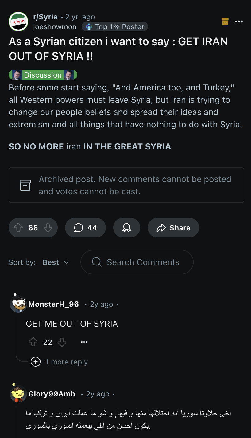 Assad kicked out the Iranians (and to some extent kept Hezbollah at arm’s length) because his army of street sluts felt uncomfortable with Shiite religious men in the country. This is literally true, not some kind of exaggeration for effect.