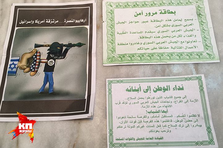 One of the pamphlets, obtained by the Kremlin-friendly Russian Komsomolskaya Pravda website, featured a cartoon of an al-Nusra front figurine being wound up by Israel and the United States.