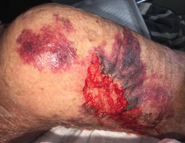 “A piece of skin on his upper right leg has been ripped off. He has so many bruises and there was blood.
