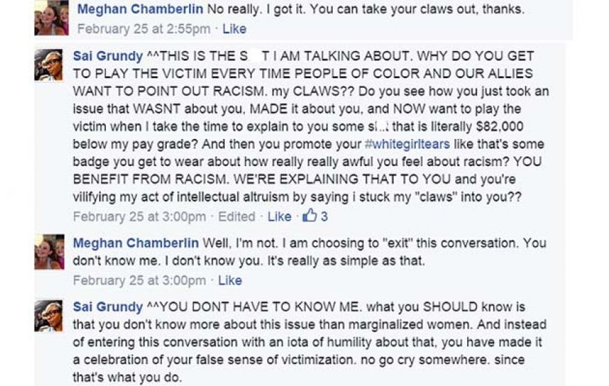 Grundy then addressed those who had witnessed the chimpout: “am I mocking her tears or am I saying that her tears are meaningless displays of emotions because they don’t reflect at ALL an intention to understand the issue from the prospective (sic) of women of color or queer women.”