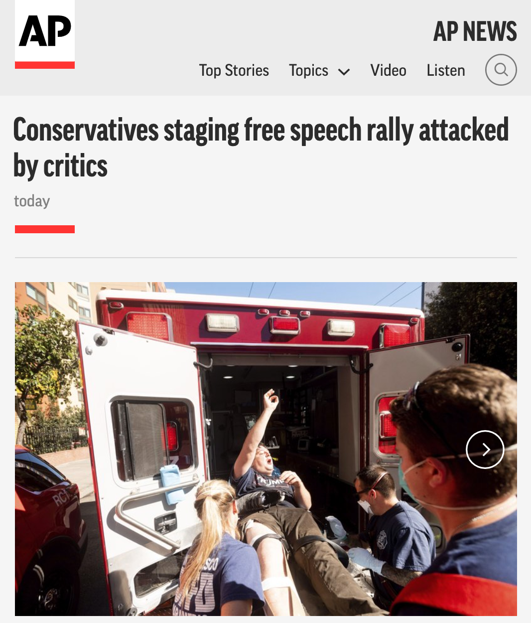 A photographer working for The Associated Press witnessed a Trump supporter being taken away in an ambulance and an injured San Francisco police officer on the ground by San Francisco’s United Nations Plaza.