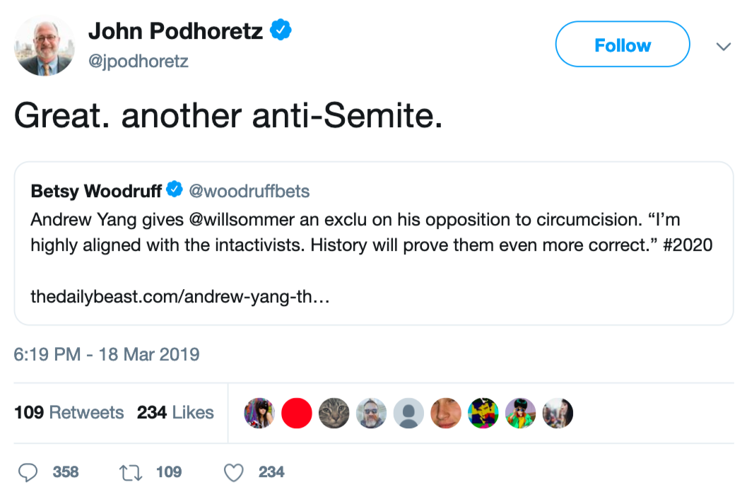 The neocon Jew John Podhoretz tweeted out “great, another anti-Semite” in response to an article about presidential candidate Andrew Yang’s vocal support for the anti-circumcision “intactivist” movement. After several days of the Tweet being available, he has gone back and deleted it.