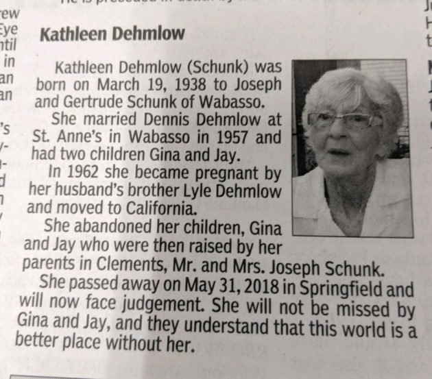 The obituary, published in Minnesota’s Redwood Falls Gazette, has been shared more than 36,000 times online and tells the life story of 80-year-old Kathleen Dehmlow. From her birth in 1938 in Wabasso, Minnesota, the five-paragraph piece remembers her marriage in 1957; the birth her two children, Gina and Jay; her 1962 pregnancy by her husband’s brother Lyle; and her decision to “abandon her children” and move to California.