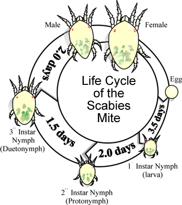 Human scabies is caused by an infestation of the skin by the human itch mite (Sarcoptes scabiei var. hominis). The microscopic scabies mite burrows into the upper layer of the skin where it lives and lays its eggs. The most common symptoms of scabies are intense itching and a pimple-like skin rash. The scabies mite usually is spread by direct, prolonged, skin-to-skin contact with a person who has scabies.
